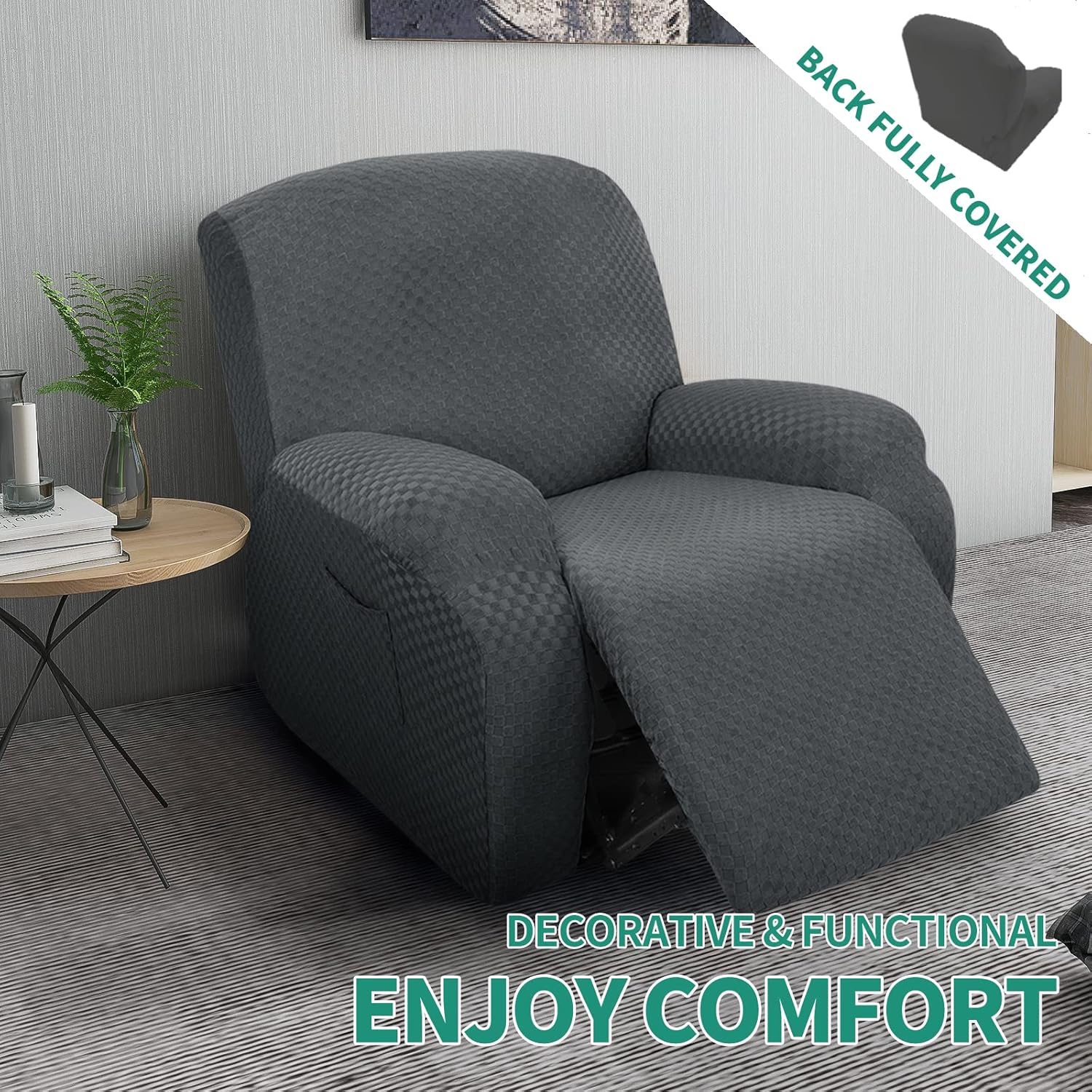 YEMYHOM 1 Piece Couch Cover + 4 Pieces Recliner Cover is the perfect choice for modern families. The upgraded magic sofa cover features a 0.6 by 0.6 inches large checks jacquard design, making it look more elegant, fashionable and generous. The 280GSM high gram thickened fabric is durable, soft and comfortable to touch, no pilling, no fading, and breathable for all season usage. The Super Stretchable elastic sofa slipcovers are flexible enough to fit most types sofas and looks like customized, made by 95% polyester microfiber and 5% spandex premium quality fabric. Anti-slip Foam Rods are Free-provided to make the couch protector covers stay in place and wrinkle-free. YEMYHOM anti-slip sofa protector cover ensures your couch is fully covered with stretchy band wrapping the bottom tightly, protecting it from cat/dog hairs and scratches, or naughty kids' graffiti and unexpected stains from everyday life. It is available in four sizes: LENGTH of CHAIR COVER 31-46″, LOVESEAT COVER 55-69″, SOFA COVER 71-91″, XL SOFA COVER 91-110″. The slip cover is removable and machine washable, separately in cold water, no bleaching, no ironing. 100% Money Back Guarantee is provided to help you buy with confidence.